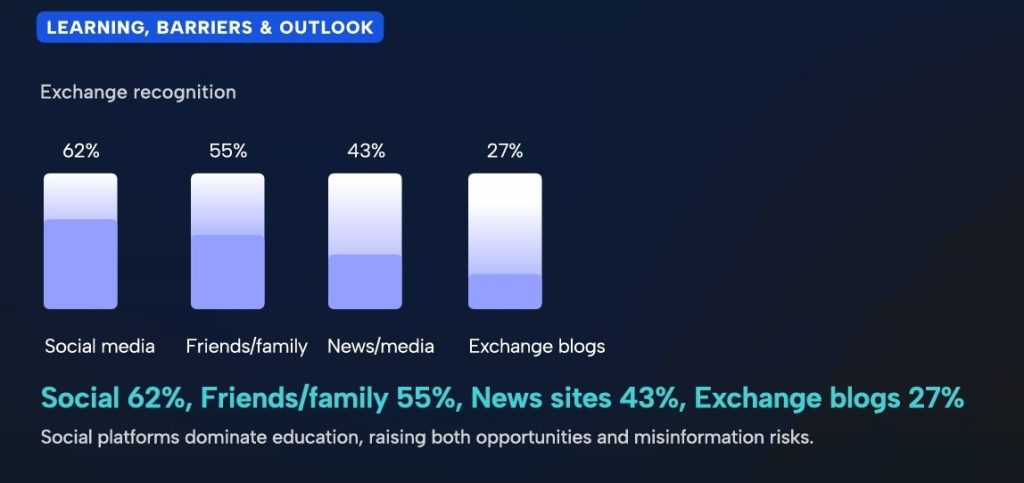 Friends and household adopted at 55%, whereas 43% cited mainstream information. Confidence ranges have been evenly divided: 48% really feel assured of their understanding of crypto, whereas 52% don’t.