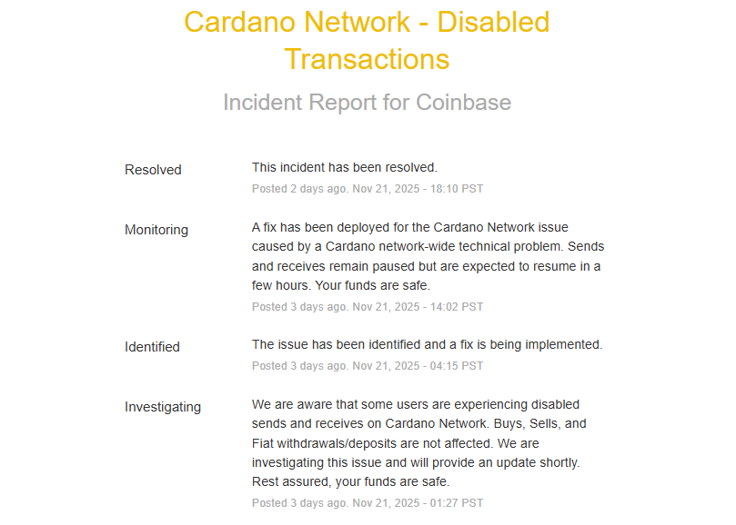 By Nov. 22, consensus had naturally re-formed, and main exchanges started restoring ADA providers. Coinbase recorded the longest downtime, suspending ADA transfers for roughly 14 hours.