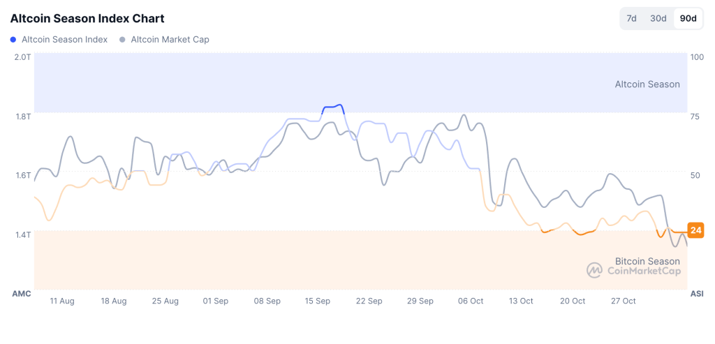 The Altcoin Season Index at 24 exhibits that almost all various property nonetheless trail Bitcoin in performance. Yet as we speak’s actions exhibit how cash linked to new product releases, compliance milestones, or enterprise use can nonetheless generate sustained buying and selling movement.