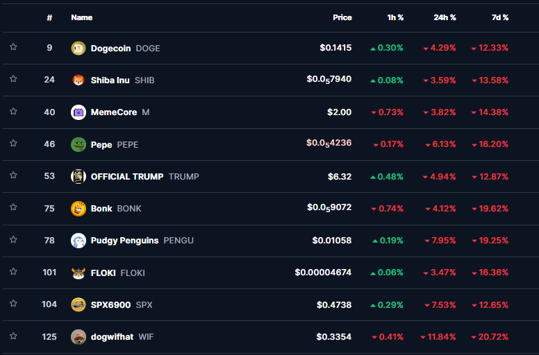 Pepe, Bonk, and Floki all posted steeper weekly declines of greater than 17%, whereas Dogwifhat noticed one of many deepest drops, at 21.13%, over the seven-day interval.