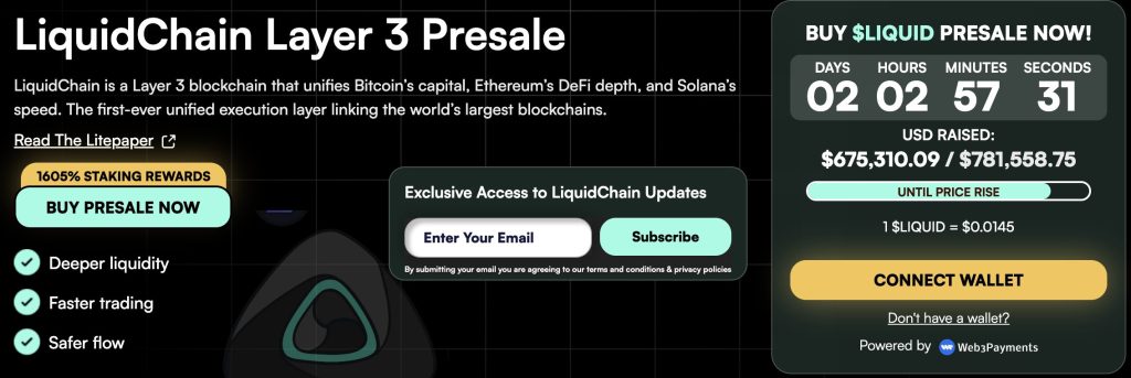 The LIQUID presale is presently priced at $0.0145, with $674,947.04 raised to this point. Features embrace a Unified Liquidity Layer, Single-Step Execution, and Verifiable Settlement backed by trust-minimized state verification. Presales carry materials threat, tokens might not checklist at a premium, and infrastructure performs require adoption to generate returns.