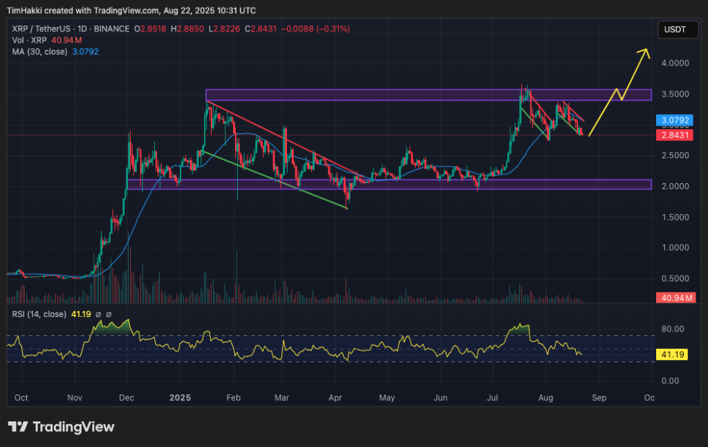 At current, XRP’s RSI sits round 41, signaling persistent promoting stress. But, many merchants view the dip as a shopping for window, particularly with Ripple deepening ties to establishments and leaning into regulatory compliance.