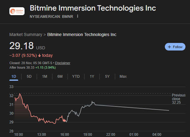 BitMine, whose enterprise has shifted towards accumulating Ethereum on its steadiness sheet, dropped 9.5% to $29.18 earlier than recovering greater than 6% in late buying and selling.