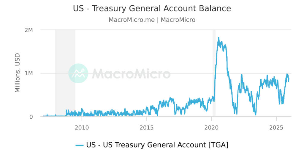 Hayes will not be being refined in regards to the scale. The TGA steadiness is sitting close to $750 billion, whereas Treasury steering factors to a goal nearer to $450 billion. That distinction alone implies roughly $301 billion flowing again into the system because the steadiness will get drawn down.