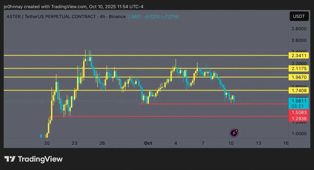 ASTER’s 4-hour chart positions value at $1.56 with a 7.21% decline, testing key assist following breakdown from $2.34 highs.
