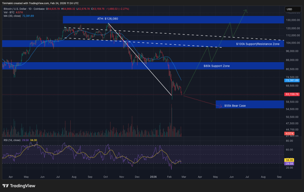 To reclaim bullish momentum, worth motion should first stabilize above $62,500 after which problem the $67,500 resistance block. Until a every day shut above that stage happens, the development stays firmly in bear territory.