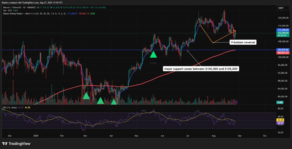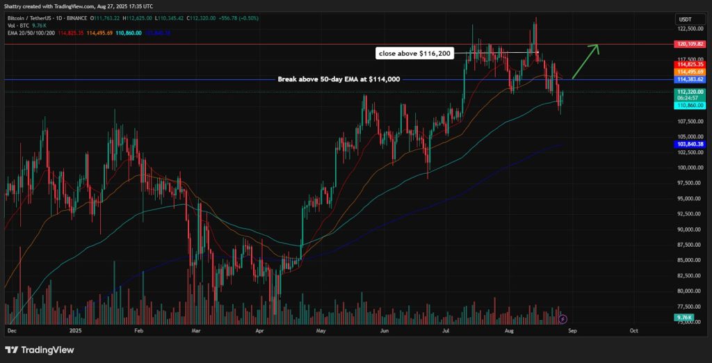 Key restoration ranges embody reclaiming $112,000 as assist with sustained quantity, adopted by breaking again above the 50-day EMA at $114,000.
