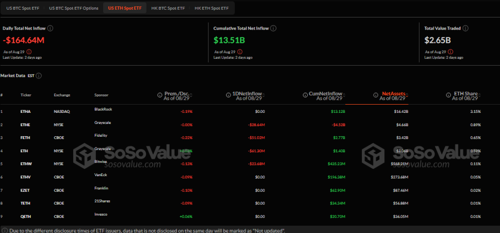 Ethereum ETFs additionally confronted headwinds on August 29, recording $164.64 million in every day outflows, halting a five-day influx streak that had added greater than $1.5 billion to the asset class.