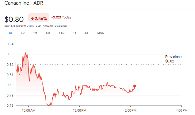 At the time of writing, Canaan shares have been altering fingers round $0.79, firmly in penny inventory territory. The inventory has not traded above $5 since 2022 and final closed above $2 in October, according to market information.