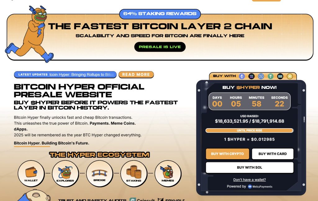 Bitcoin Hyper ($HYPER) is positioning itself as the first Bitcoin-native Layer 2 powered by the Solana Virtual Machine (SVM). Its aim is to broaden the BTC ecosystem by enabling lightning-fast, low-cost sensible contracts, decentralized apps, and even meme coin creation.