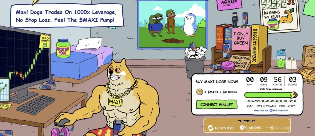 You can purchase $MAXI on the official Maxi Doge website utilizing ETH, BNB, USDT, USDC, or a financial institution card.