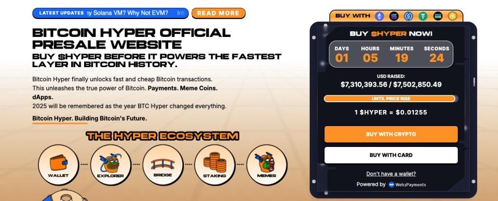 Bitcoin Hyper ($HYPER), the first BTC-native Layer 2 powered by the Solana Virtual Machine (SVM), has raised over $7.3 million in its public presale, with $7,310,393 out of a $7,502,850 target. The token is priced at $0.01255, with the next price tier expected to be announced soon.