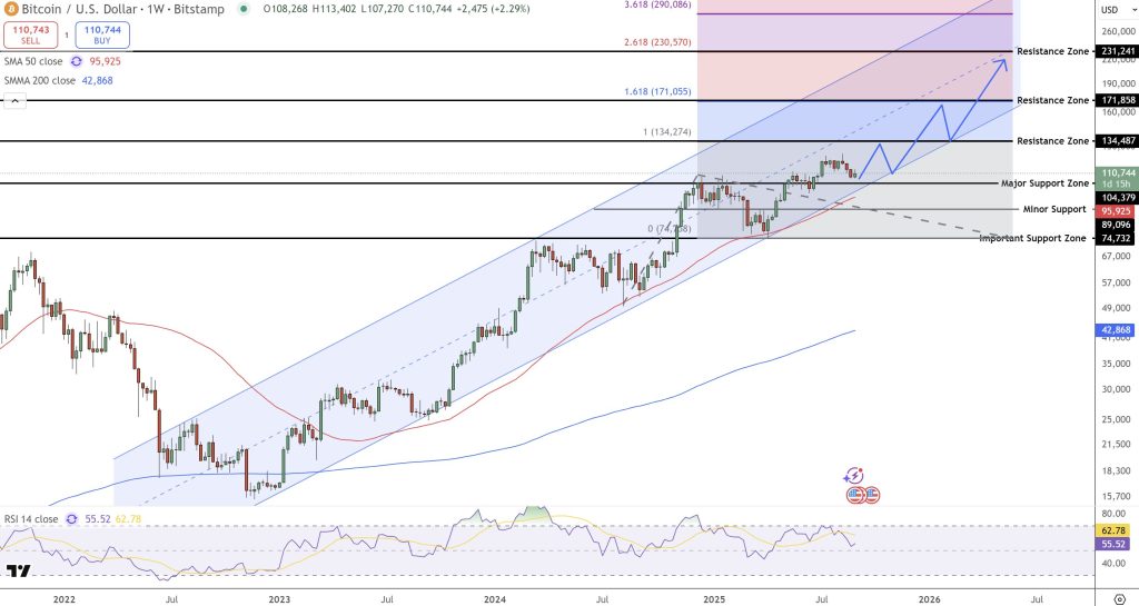 The subsequent main resistance sits close to $134,500, with Fibonacci ranges projecting potential features towards $171,000 and even $231,000 if momentum accelerates. Support between $95,000 and $100,000 ought to entice patrons, conserving the broader uptrend intact.