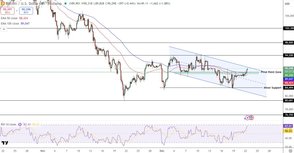 From a technical perspective, Bitcoin price prediction appears bullish amid breakout of descending channel on the 4-hour chart. Price has shaped increased lows since the mid-December backside close to $84,500, pointing to enhancing dip demand.