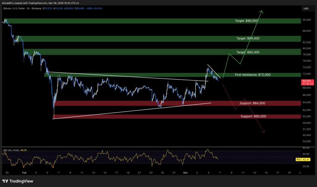 Now Bitcoin is drifting again towards the $70,000 zone once more. If that degree offers manner, momentum may shift decrease with $64,000 as the following main assist.