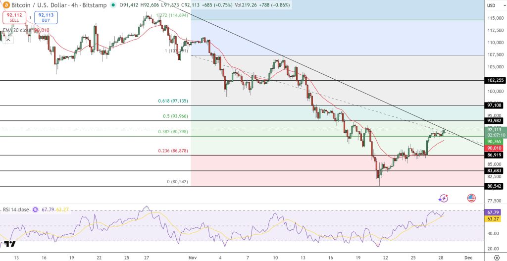 Bitcoin’s technical construction now strengthens the bullish case. On the 4-hour chart, BTC is urgent in opposition to a descending trendline that has capped each rebound since early November.