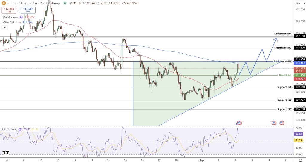 The RSI at 60 indicators momentum is wholesome however not overextended. A bullish engulfing candle at $111,200 confirms demand is robust. If Bitcoin clears $113,400, it may run towards $115,600 and $117,500. On the draw back, if assist at $111,200 breaks, we may see dips to $109,350 or $107,407.