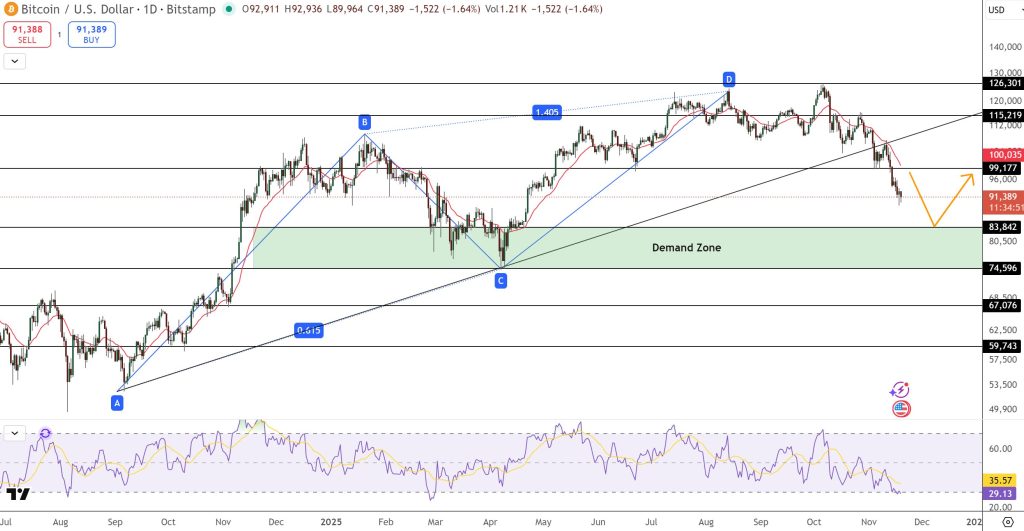 Bitcoin is approaching a significant each day demand zone between $83,800 and $75,000, which has generated sturdy rallies twice this yr. Price remains to be transferring inside a descending channel, however momentum is slowing. The RSI close to 30 reveals early indicators of vendor fatigue, whereas lengthy decrease wicks trace at buy-side testing.