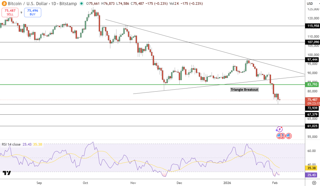 On the 4-hour chart, BTC remains to be transferring inside a steep downward channel. To change the present adverse outlook, it wants to shut above the higher boundary close to $79,355. The Daily RSI has dropped to about 25.43, a very oversold stage not seen for the reason that 2020 crash. This usually comes earlier than a sturdy bounce as promoting stress fades.