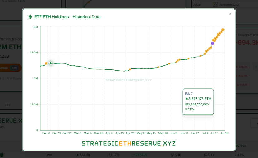 Meanwhile, ETH ETFs hold 5.82 million ETH, valued at $22.23 billion. Inflows have been consistent, with 17 consecutive days of net additions totaling more than 433,000 ETH during the past week alone.