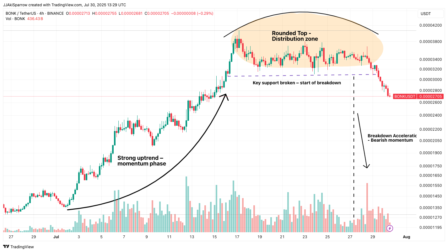 After multiple rejections near $0.00003800, the rounded top resolved into a clear breakdown once the $0.00003000 support failed.