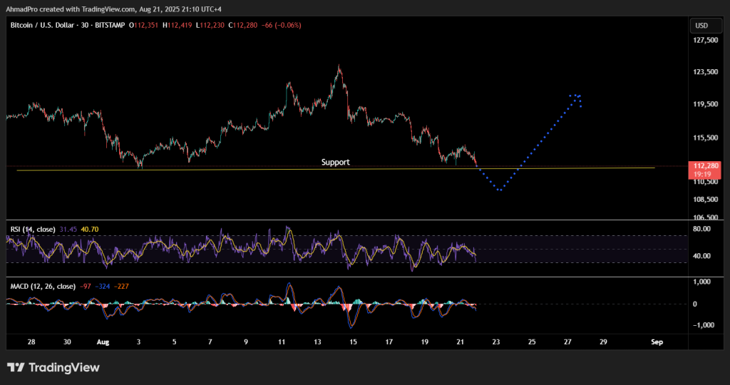 Bitcoin’s in a bit of a dip right now, dropping toward a key support level around $112,000. This is the same level it bounced from to reach its all-time high (ATH).