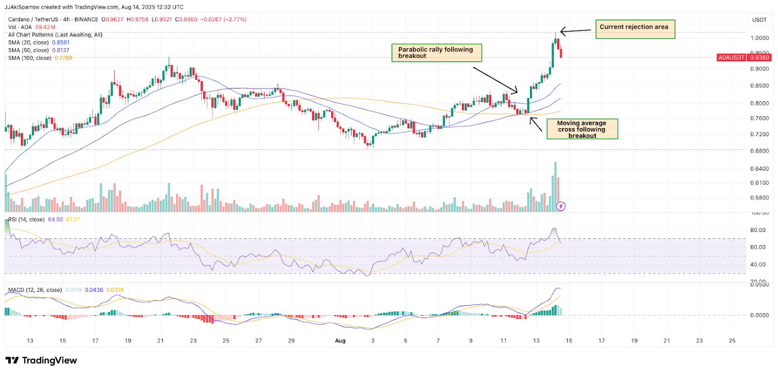 ADA Price Rejection Halts Parabolic Advance After Moving Average Breakout