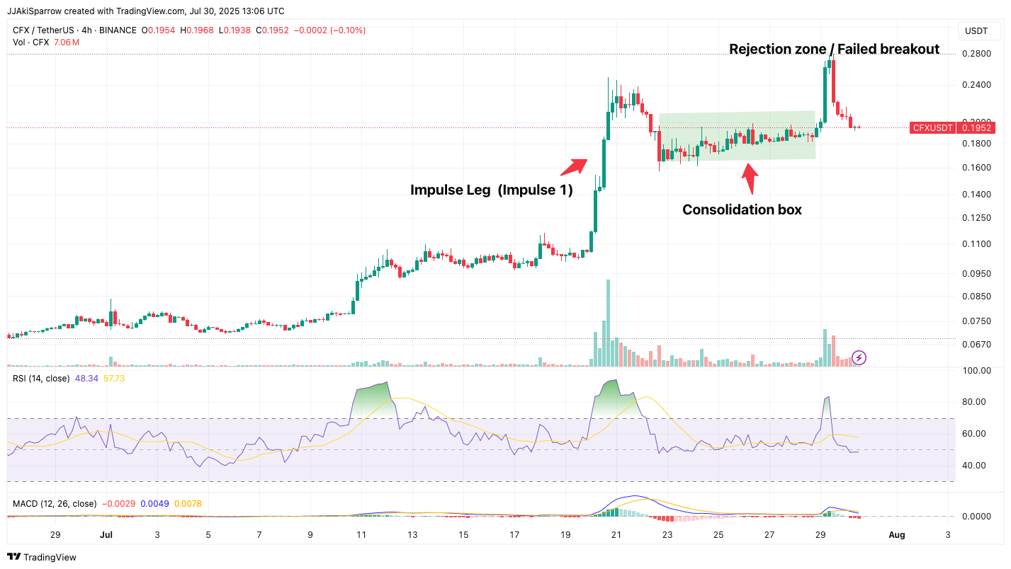 The recent price action on $CFX/USDT marks a sharp contrast to the clean, directional rally seen earlier in July.