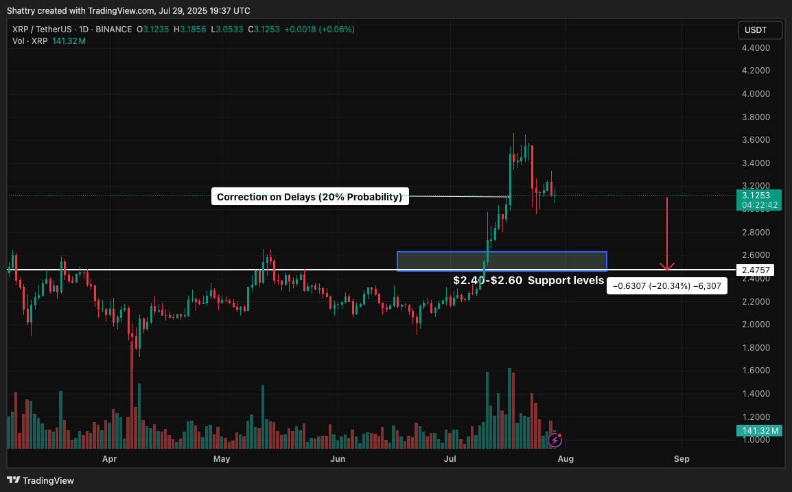 Delayed regulatory resolution could result in extended consolidation between $2.80-$3.30, allowing technical indicators to reset while institutional positioning continues.
