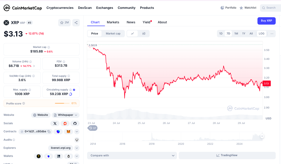XRP’s current price of $3.09 reflects a -1.47% daily decline from an opening price of $3.14, establishing a trading range between $3.17 (high) and $3.09 (low).