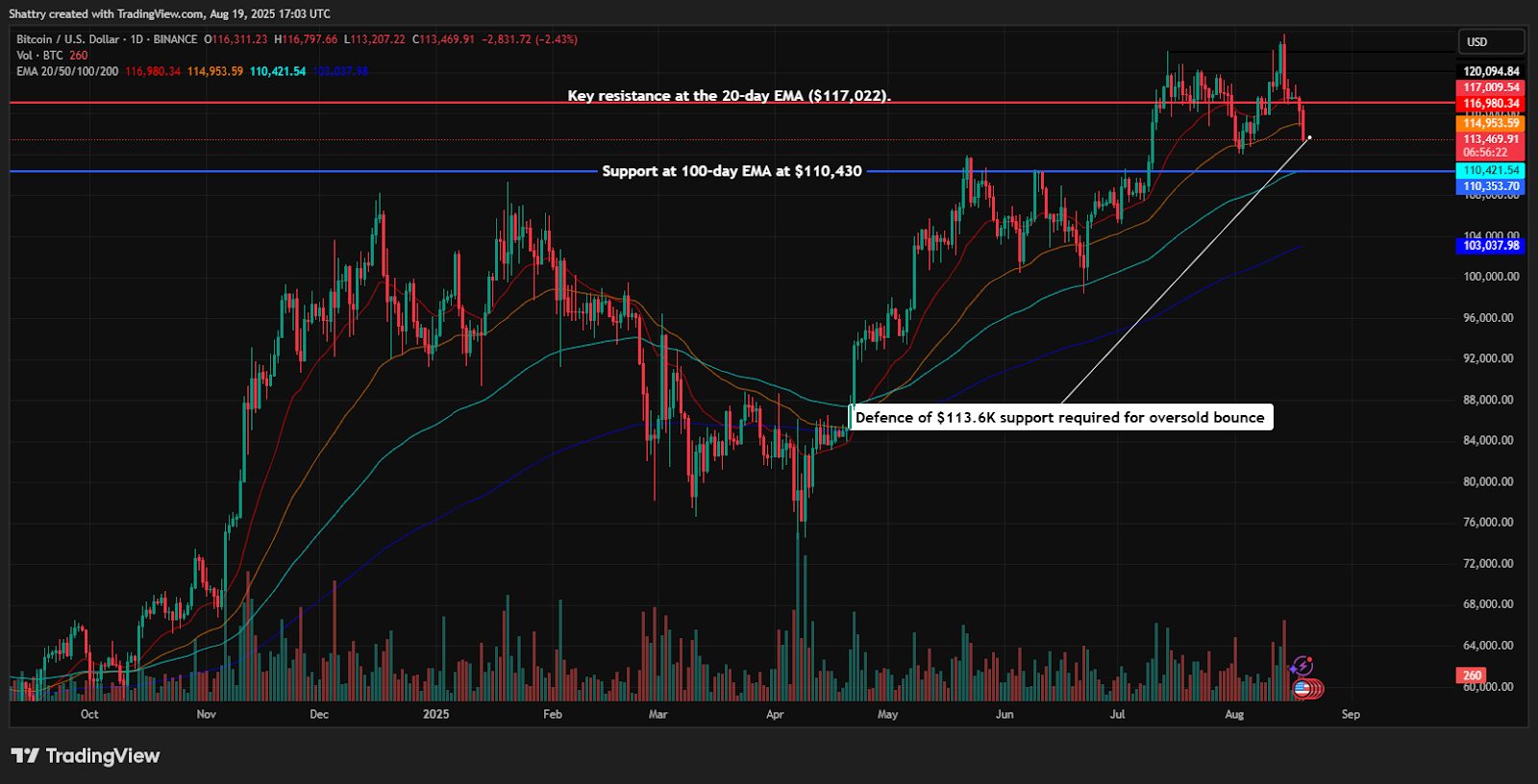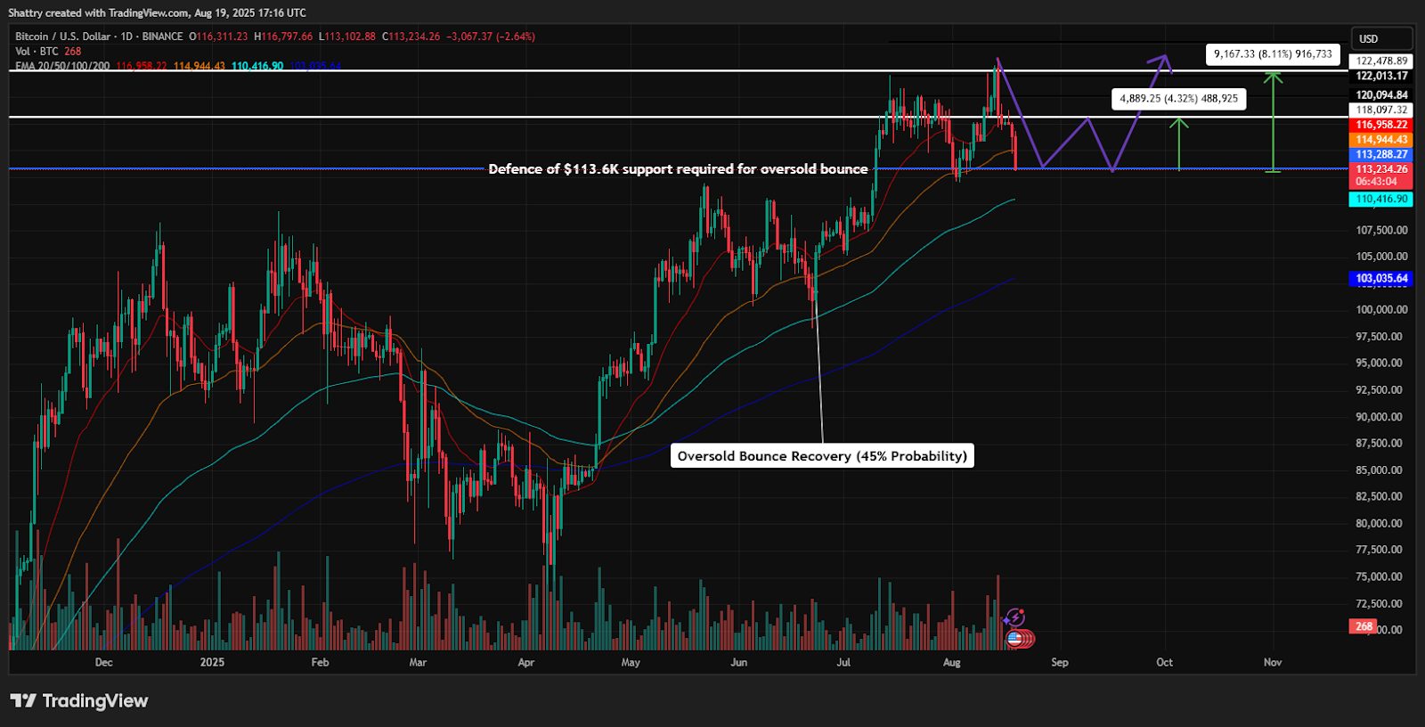 The breakdown to $113.6K represents institutional profit-taking validation versus oversold bounce potential as technical indicators method excessive ranges.