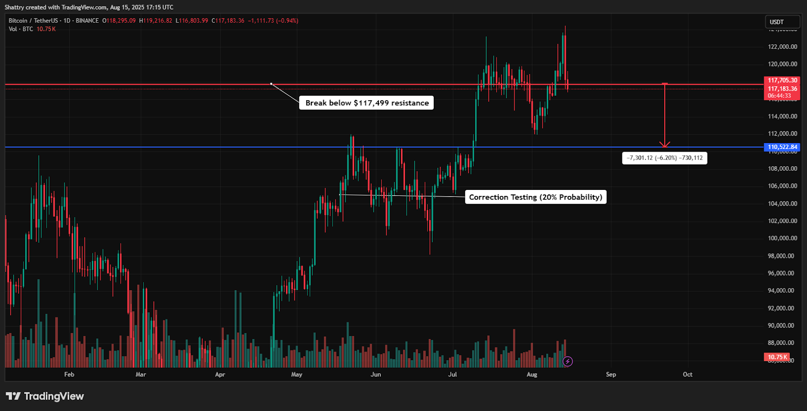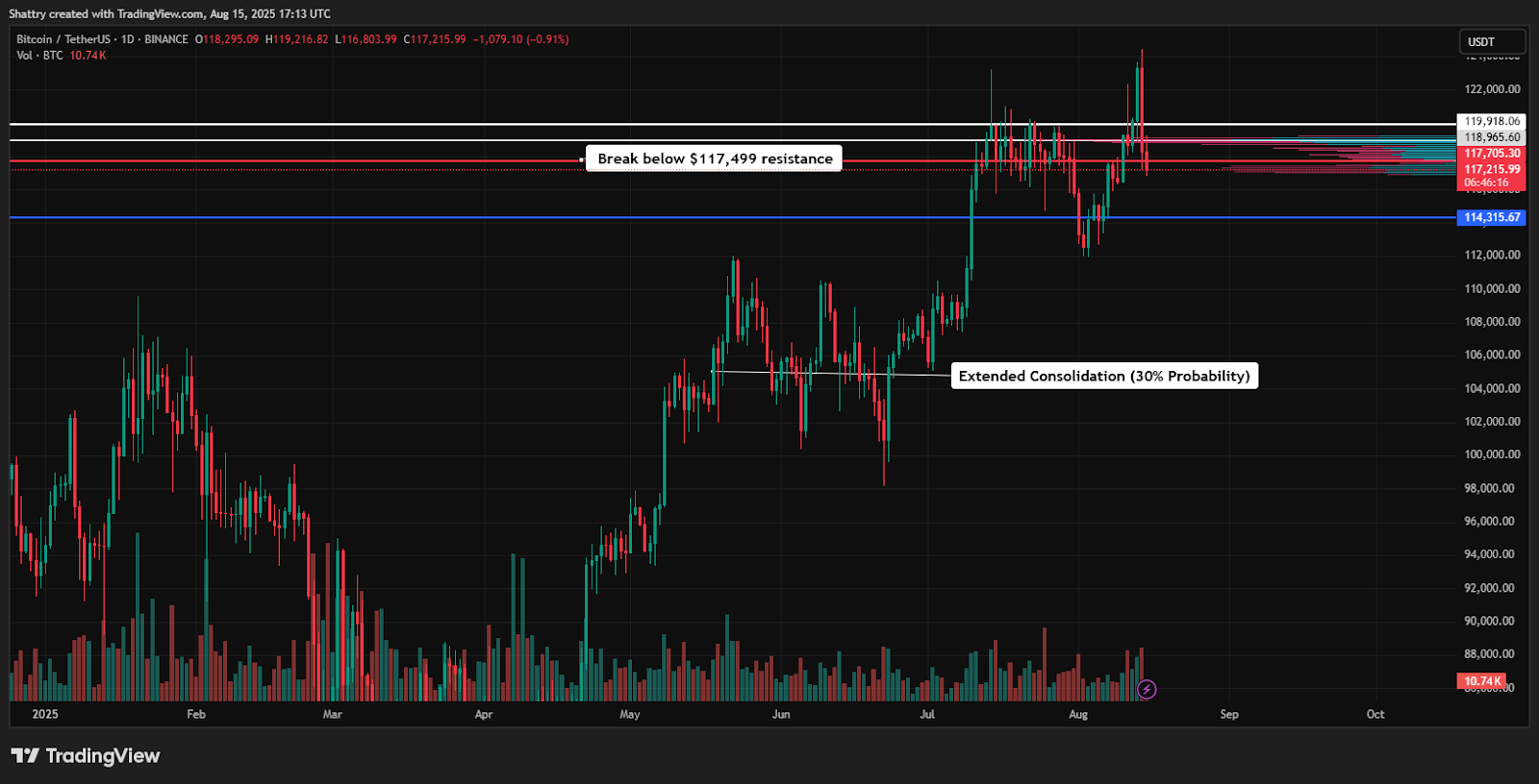 Breaking this level could trigger momentum toward $119K$121K targets, while failure might test $114K$110K support zones.