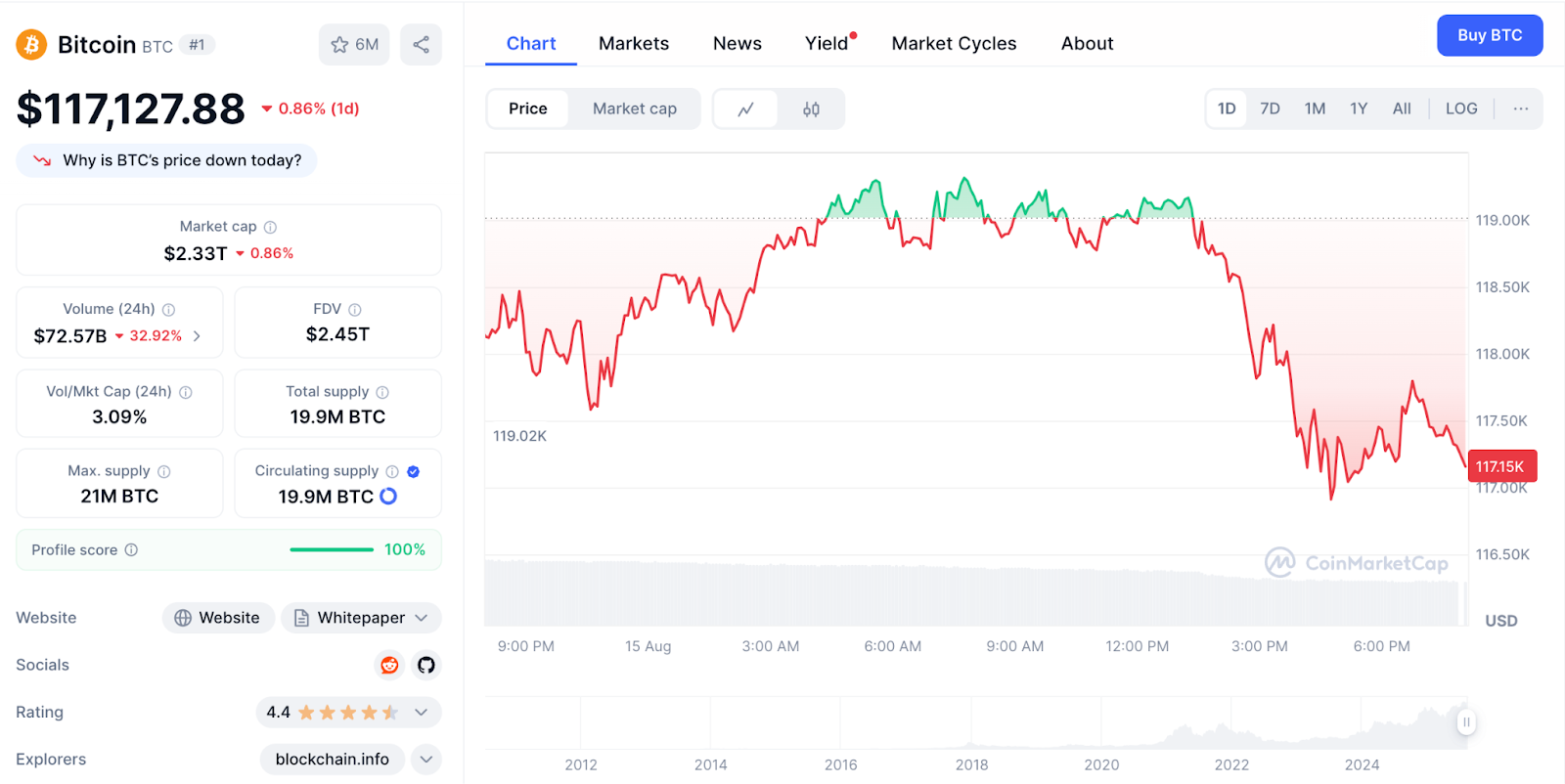 Current pricing maintains a 5.12% discount to the August 14 all-time high of $124,457 while securing extraordinary gains from historic lows.