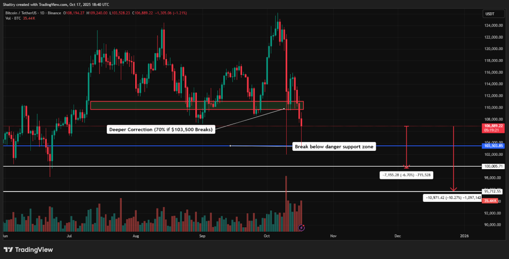 Break beneath $103,500 triggers deeper correction towards $100K with potential extension to $95K$97.5K.