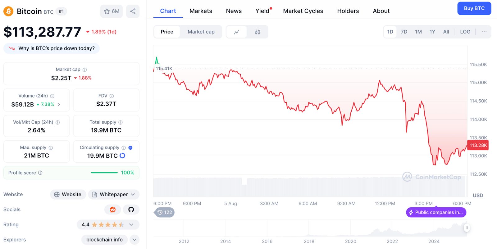 Bitcoin’s current price of $113,155 reflects a concerning -1.46% daily decline from the opening price of $114,827, establishing a trading range between $114,893 (high) and $112,650 (low).