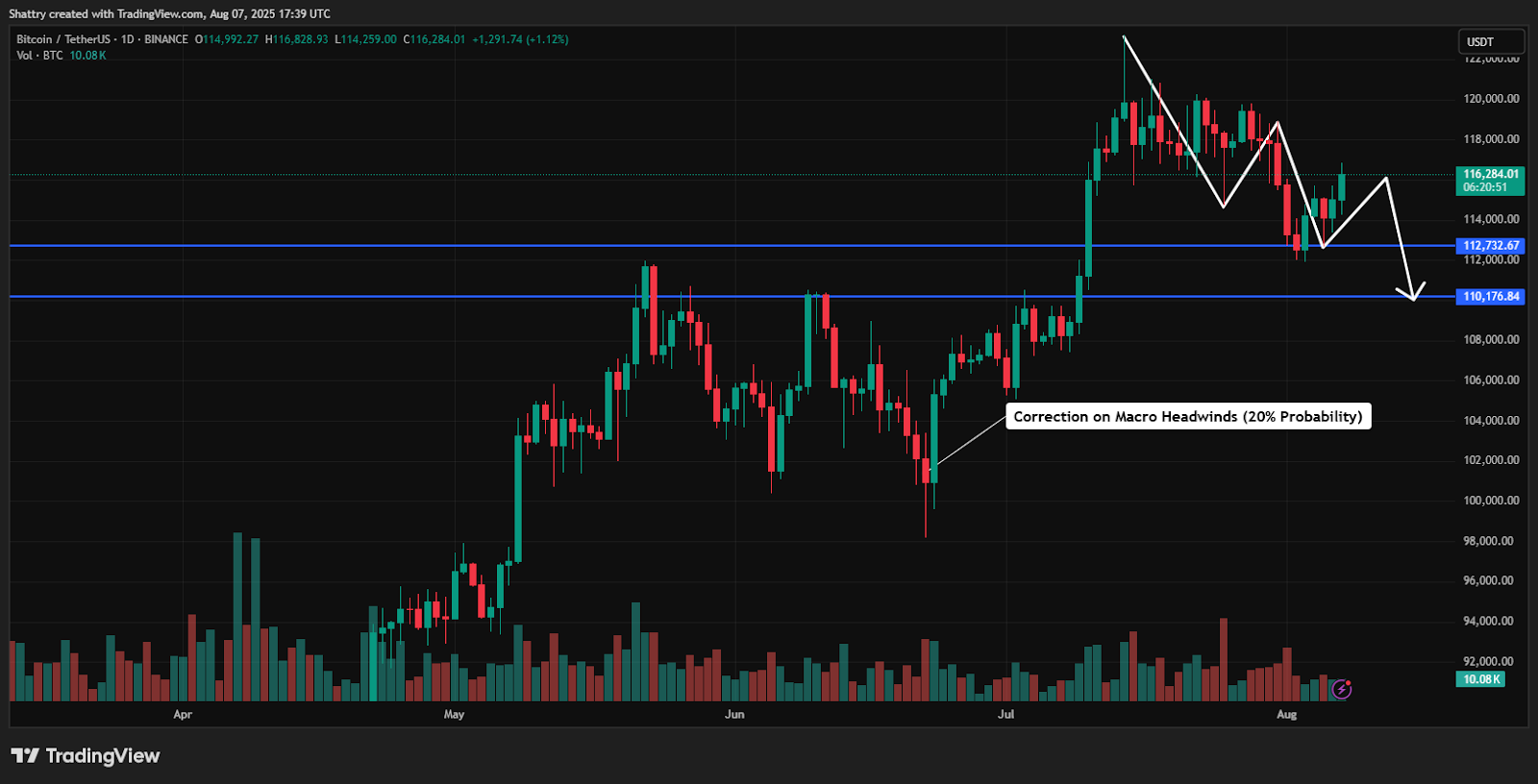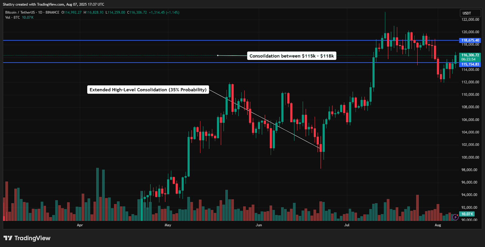 This scenario requires sustained volume above 50K daily and a successful break above $117K resistance.