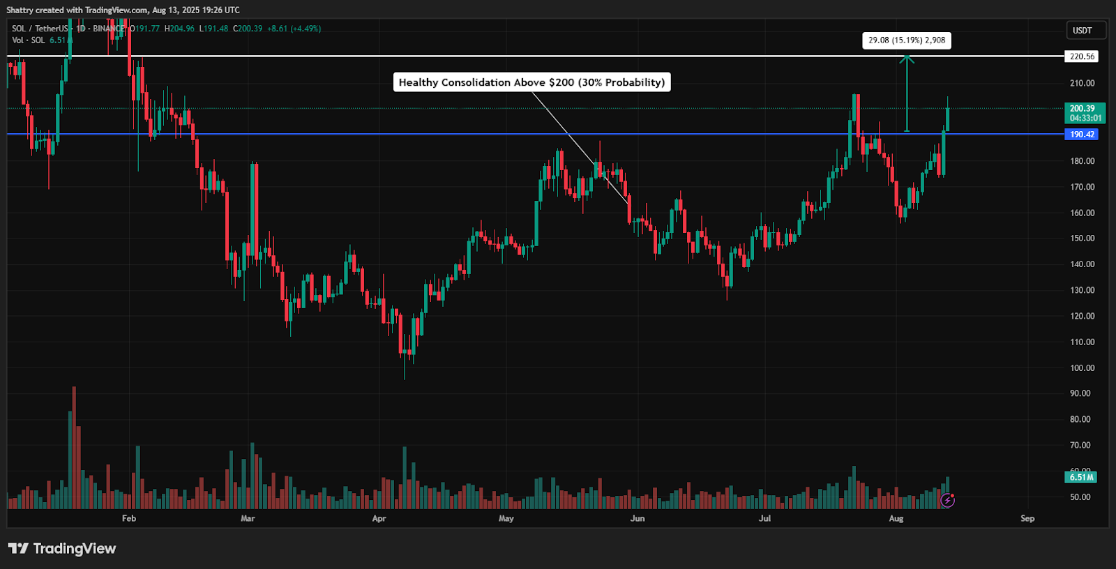 Continued altseason rotation combined with ecosystem expansion could drive explosive appreciation toward $250–$300, representing 25–50% upside from current levels.