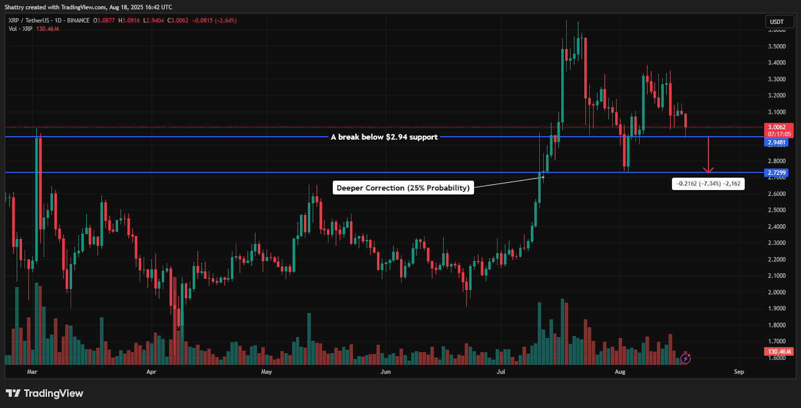 XRP’s current price of $3.0047 reflects a -2.69% decline from the opening price of $3.0877, establishing a volatile trading range between $3.0916 (high) and $2.9404 (low).