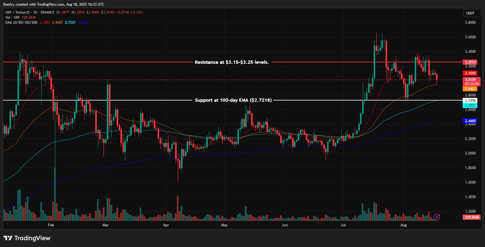 Moving averages reveal mixed positioning, with XRP below the 20-day EMA at $3.1042 (+3.3%) but maintaining strength above the 50-day EMA at $2.9422 (-2.1%), the 100-day EMA at $2.7218 (-9.4%), and the 200-day EMA at $2.4464 (-18.6%).