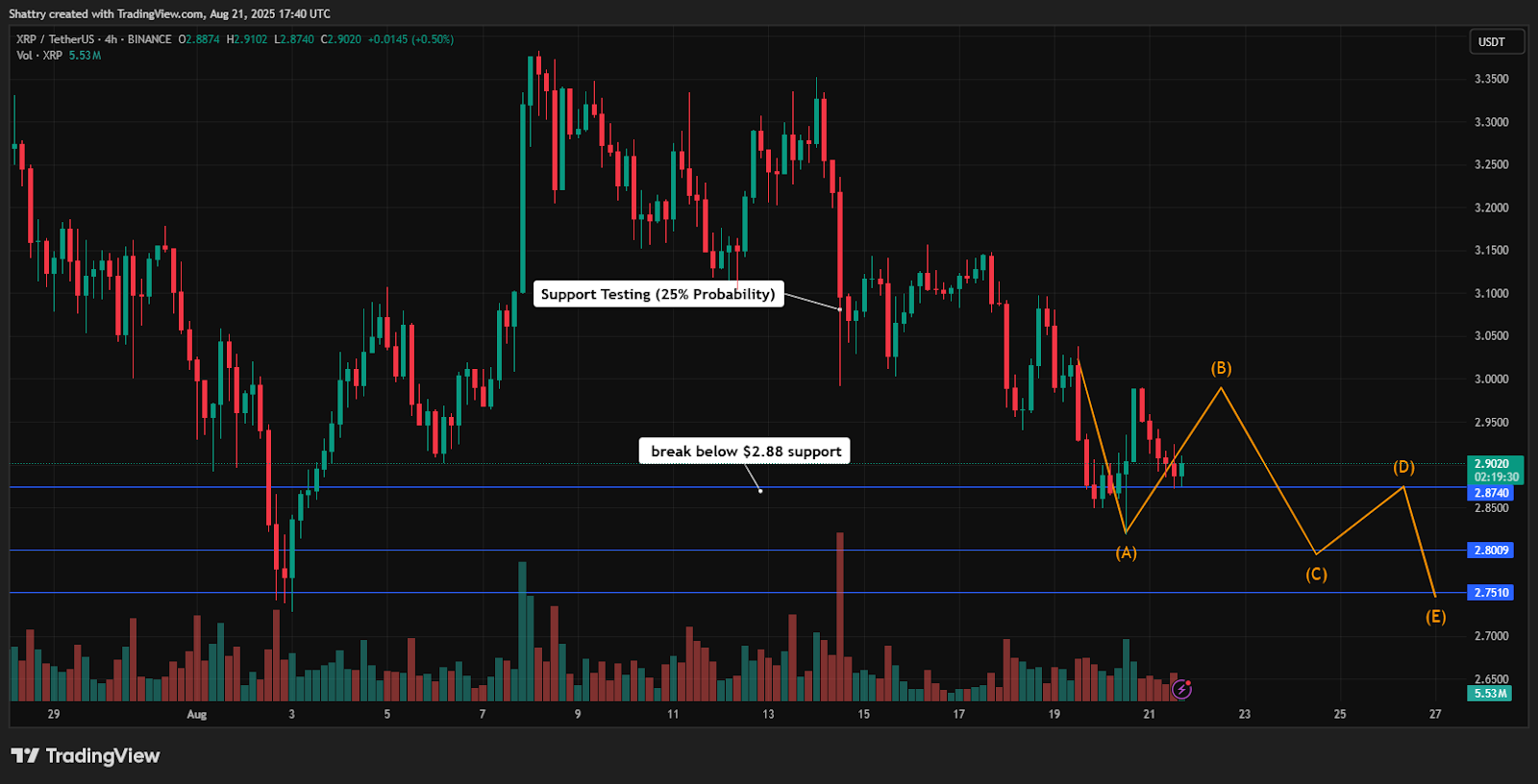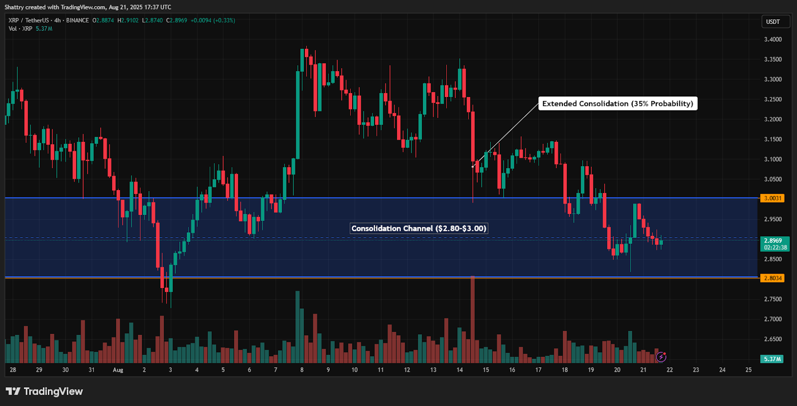 The consolidation beneath $2.90 represents institutional positioning amid SWIFT integration developments and RLUSD ecosystem growth validation.