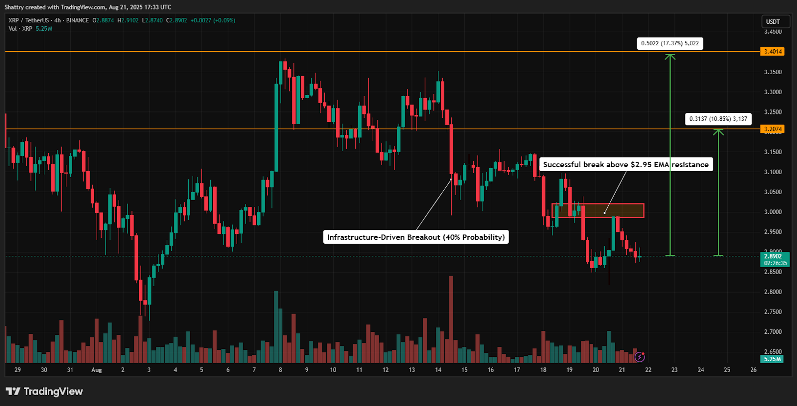 A profitable break above $2.95 EMA resistance, mixed with SWIFT integration progress, might drive restoration towards $3.20–$3.40, representing 10–17% upside from present ranges.
