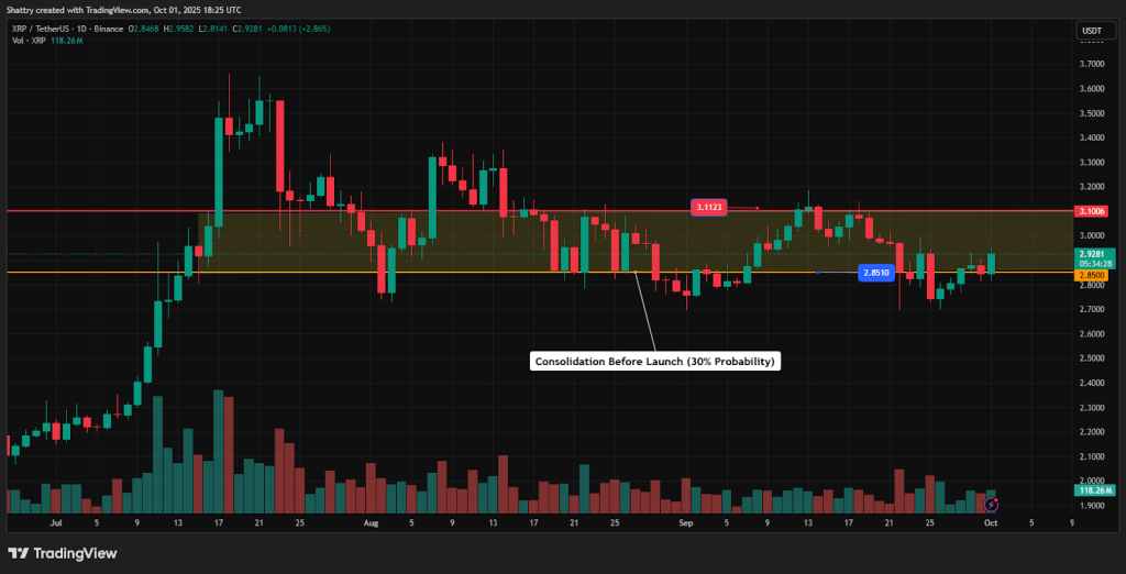 Successful break above $3.00 mixed with October ETF approvals may drive XRP towards $3.50–$4.00, representing 18–35% upside from present ranges.