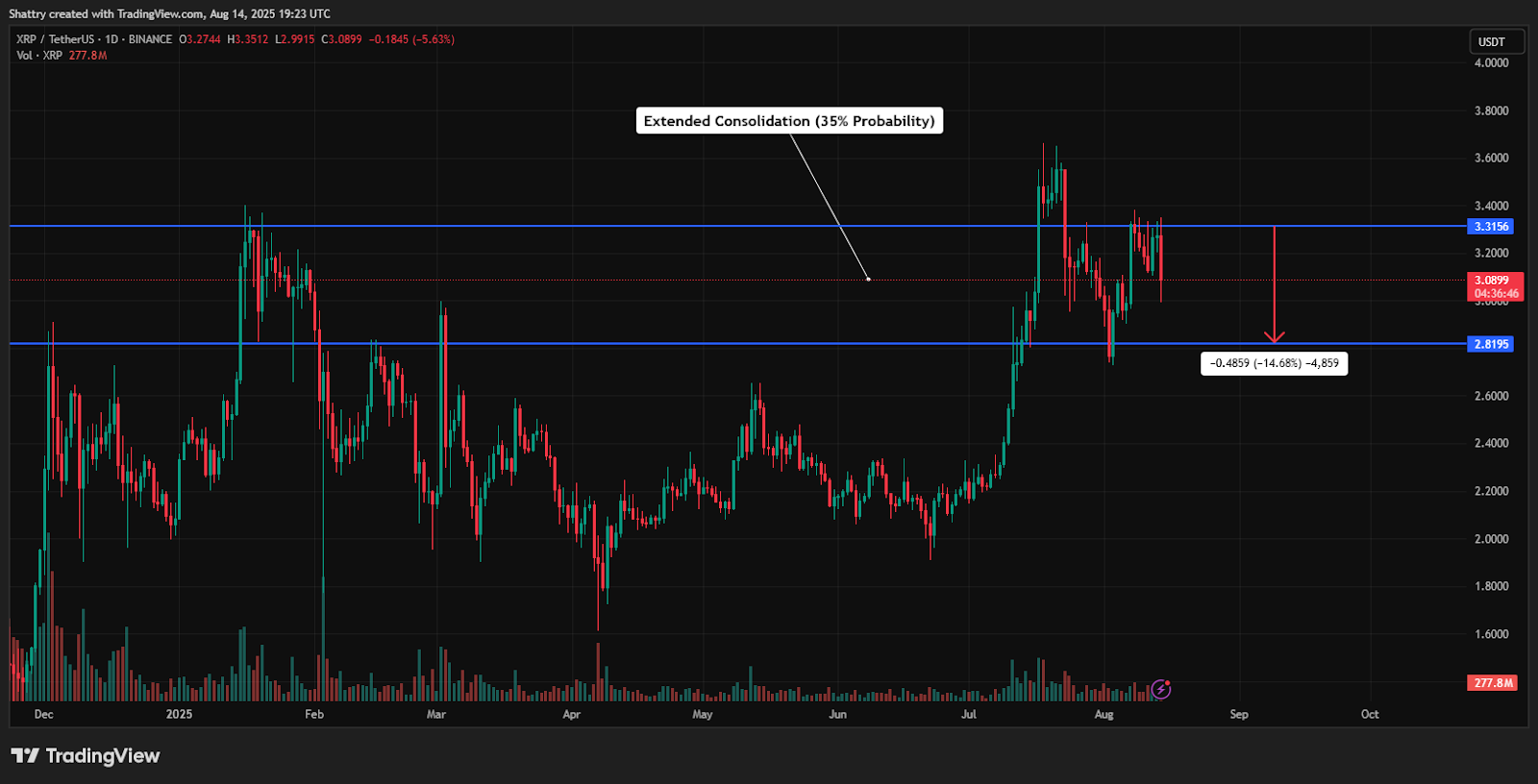 Continued market uncertainty could result in consolidation between $2.80 and $3.30, allowing technical indicators to reset while infrastructure development continues.