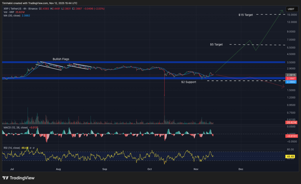 On the technical facet, XRP’s value has remained comparatively secure since mid-summer, with two bullish flag patterns rising throughout that season. XRP’s present relative power index (RSI) of 48 displays additional stability in the quick time period.