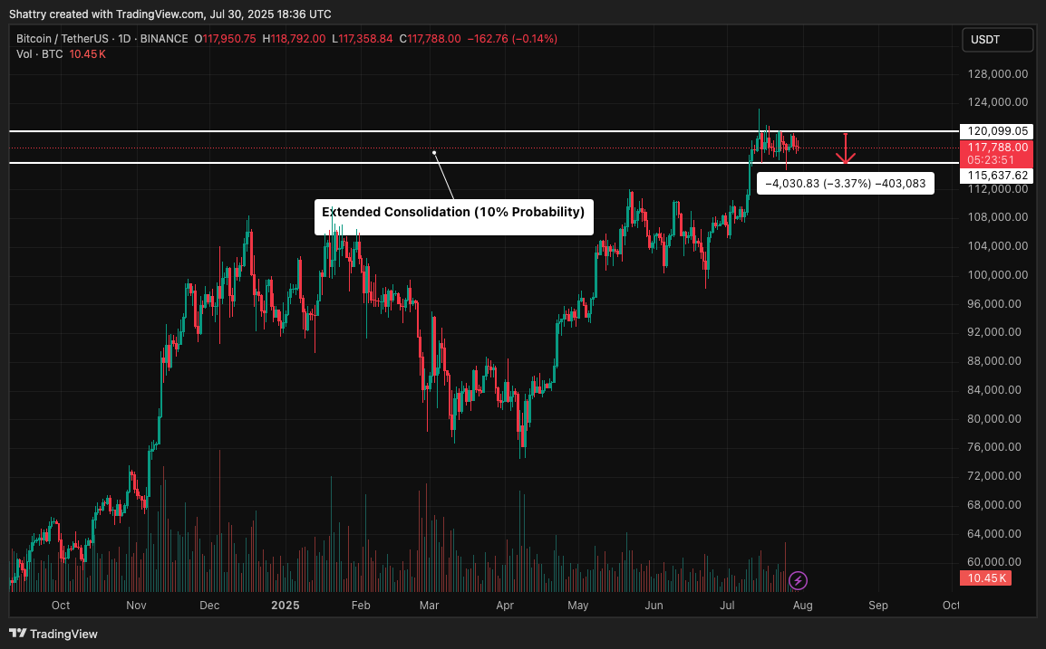 - Days 1-14: Breakout above $118,500 with volume confirmation