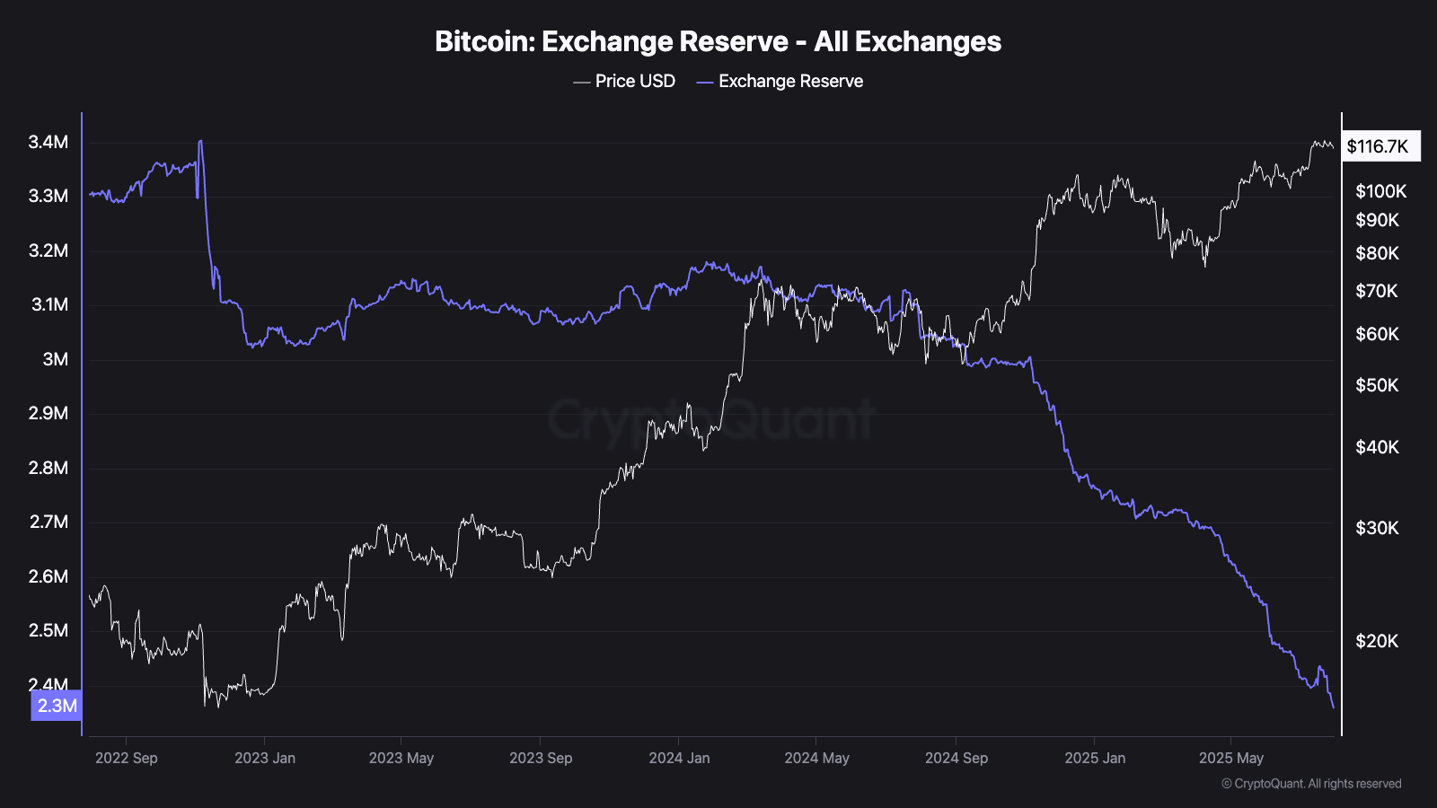 Exchange reserves continue declining as institutions move holdings to cold storage, while long-term holders maintain positions despite near-ATH pricing.