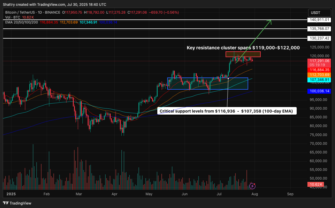 Key support levels include $116,936 (20-day EMA) as key short-term support, $112,725 (50-day EMA) as major trend support, and $107,358 (100-day EMA) as key long-term support.