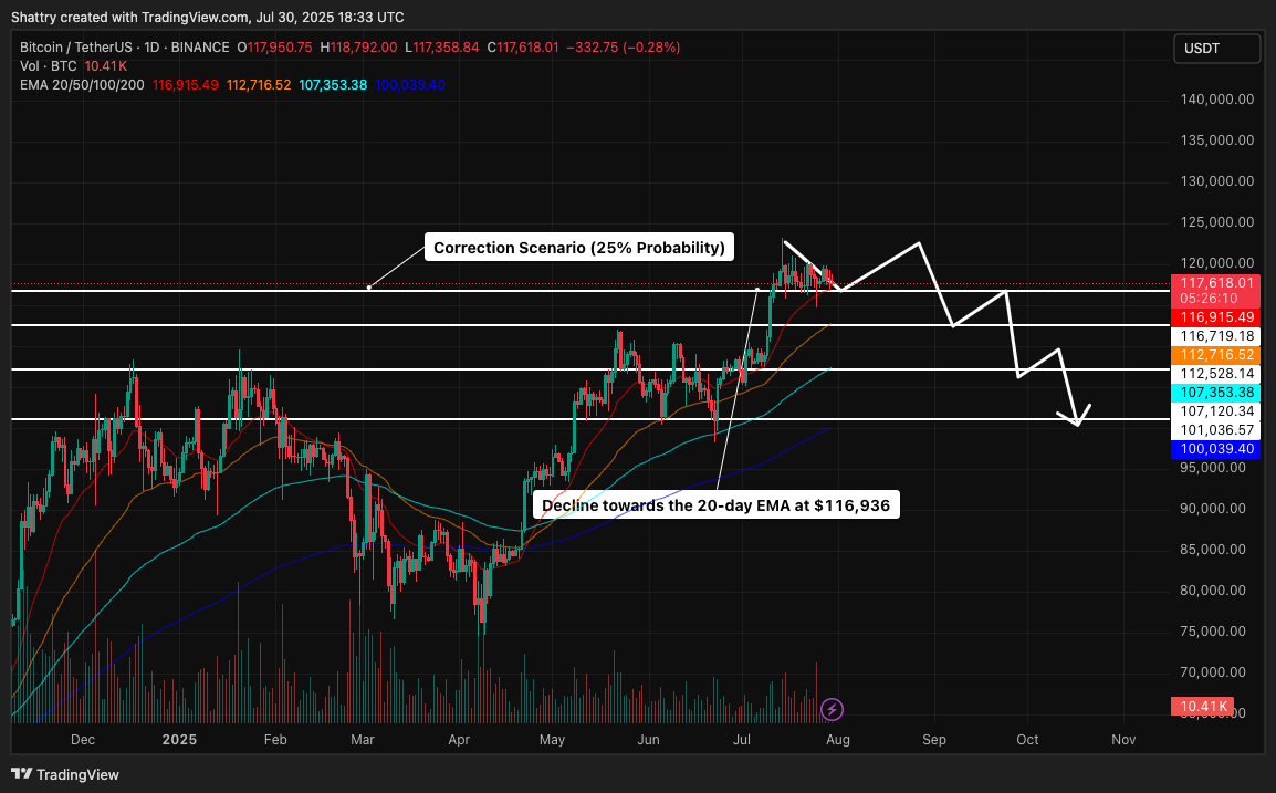 Initial decline would target the 20-day EMA at $116,936, followed by potential testing of 50-day EMA support at $112,725. Deeper correction could reach the 100-day EMA at $107,358 or psychological $100,000 support.