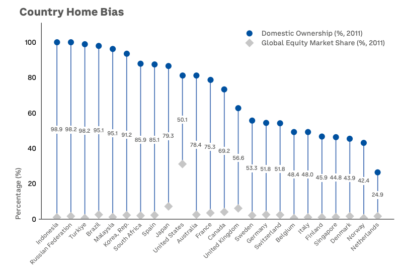 Data exhibits home fairness holdings far exceeding nations’ share of world market capitalization, with buyers in Indonesia, Russia, and Turkey allocating over 95% of portfolios to native markets regardless of representing fractions of world fairness worth.