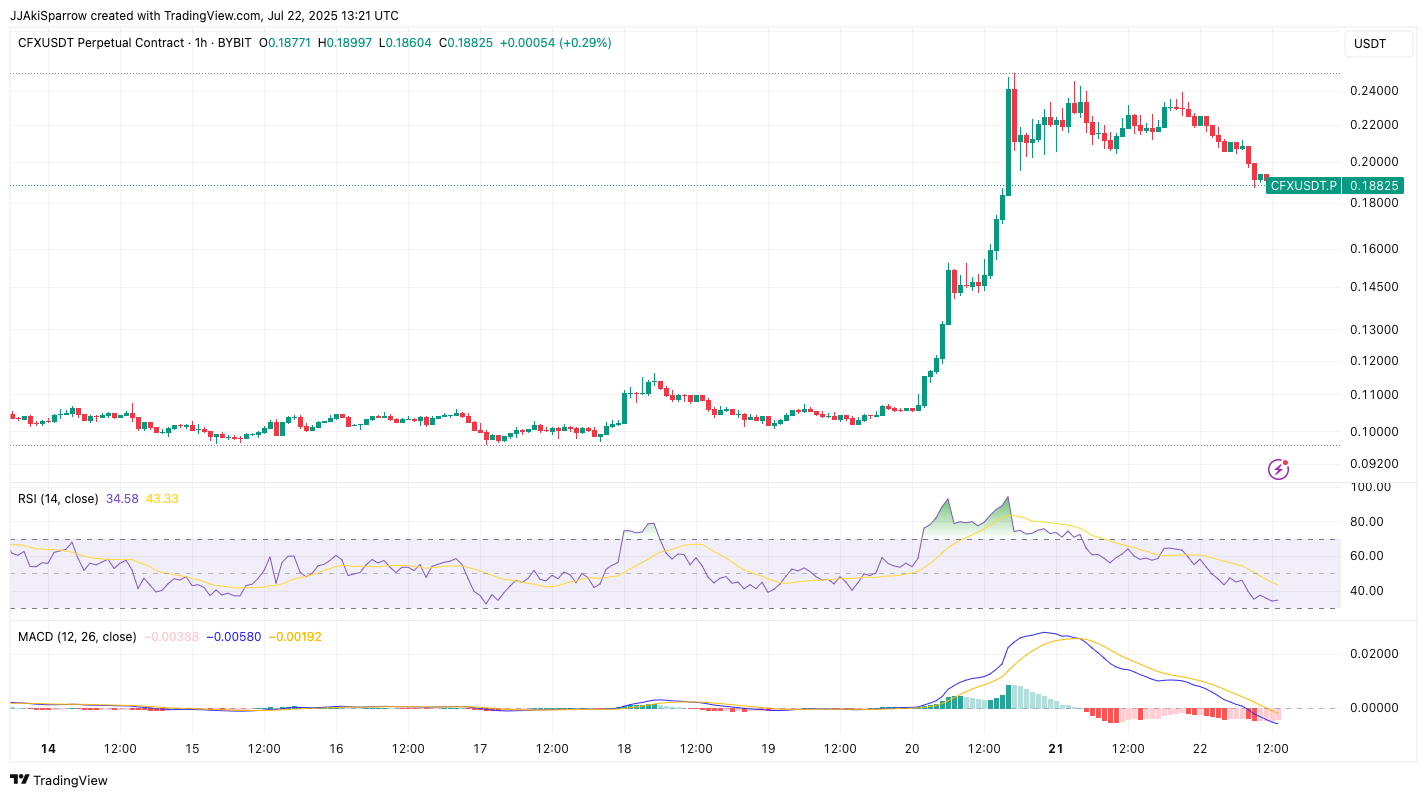 $CFX/USDT has shifted into a corrective phase after an explosive rally that set its latest high on Sunday, July 20, at $0.248, a level it retested briefly on Monday, July 21.